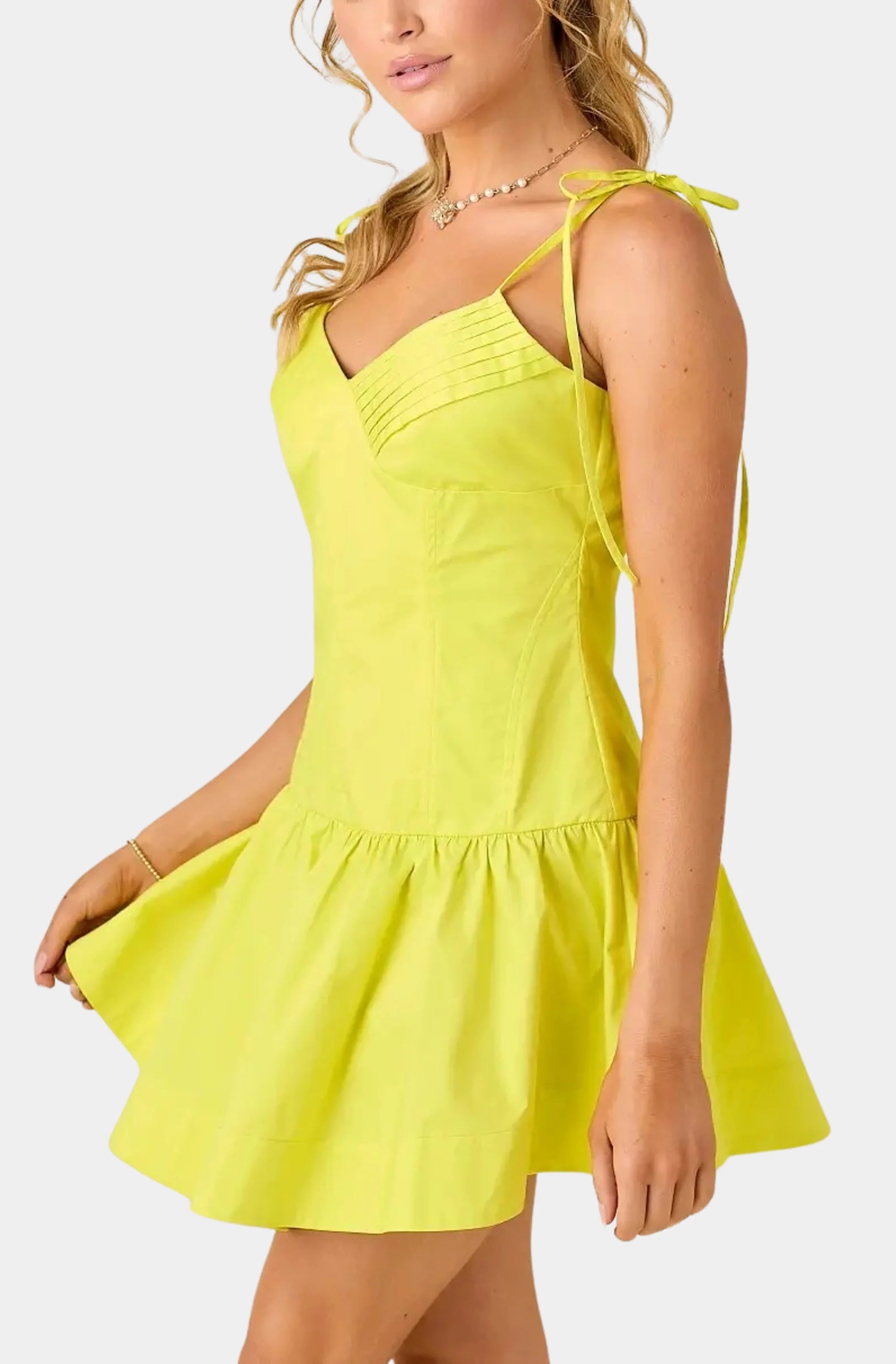 Step into the spotlight with the Zaza Mini Dress in a refreshing lemon hue. This chic dress features a flattering v neckline and intricate pintuck detailing, adding a touch of elegance to your look. The back zipper ensures a seamless fit, making it a perfect choice for any occasion. Embrace style and comfort with this must-have addition to your wardrobe.